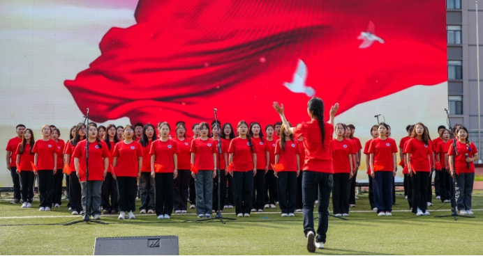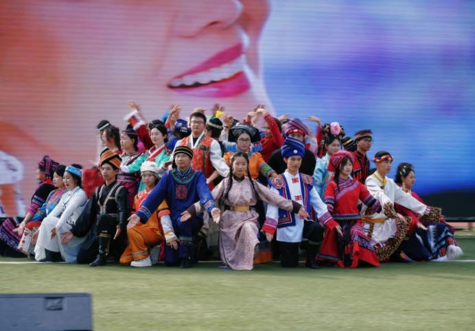 开幕式现场,在银色的毡房前、绿色的草地上,穿着盛装的各民族师生共享文体盛宴。合唱“我和我的祖国”用铿锵的歌声表达对祖国76周年华诞的美好祝福。56个民族服装舞“石榴花开”,用优美的舞姿展现“中华民族一家亲,同心共筑中国梦”的和谐画面。好来宝“铁牤牛”用经典的说唱艺术体现草原儿女对社会主义建设伟大成就的赞美。综艺“欢乐那达慕”用歌声、搏克和射箭队表演展示了校园那达慕的独特魅力。