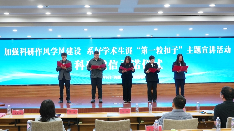 活动现场,内蒙古大学联合内蒙古科学技术研究院、自治区人民医院、内蒙古免疫学会发布了科研诚信倡议书,向全区科研工作者发出恪守学术诚信、弘扬优良学风的号召,并组织青年科研人员和研究生代表与自治区农牧业科学院、自治区第四医院、内蒙古生物工程学会青年科研人员代表共同作出科研诚信承诺,用坚定的誓言表达了坚守学术初心、共同构建良好科研生态的决心。