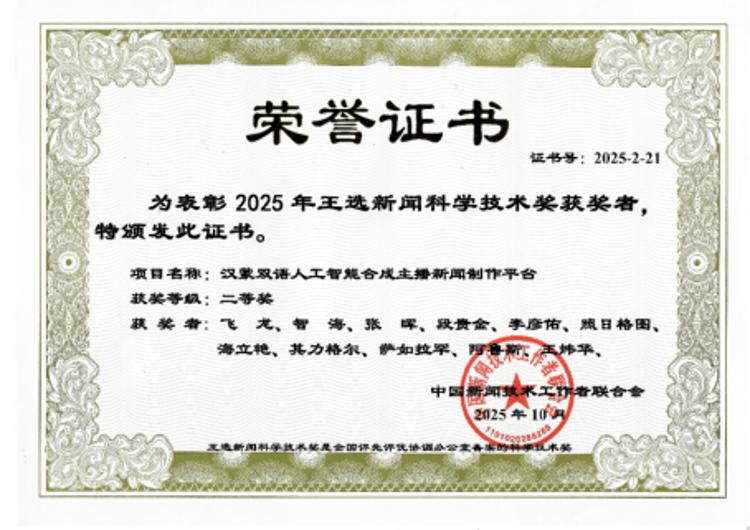 近日,2025年度“王选新闻科学技术奖”颁奖大会在四川成都举行。由内蒙古大学与内蒙古日报社联合研发的“汉蒙双语人工智能合成主播新闻制作平台”项目荣获二等奖。这是内蒙古大学首次获得该奖项,标志着学校在多语种智能化和媒体深度融合领域的技术创新实现历史性突破。