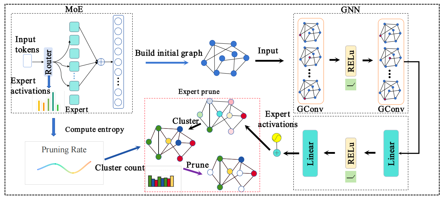 论文题目: C-GNN-PRUNE: A Unified Graph-Based Framework for Structure-Aware Pruning of Mixture-of-Experts Models 作者:李林(内蒙古大学硕士研究生)、王燕(内蒙古大学)(通讯作者)、王卓鹏(内蒙古大学硕士研究生) 论文简介:稀疏专家混合(MoE)结构在扩展大型语言模型(LLMs)方面展现出卓越的计算效率,但其庞大的参数规模仍然制约了部署效率。现有剪枝方法多忽视专家间的结构依赖与层间异质性,导致剪枝后性能退化与结构破坏。针对上述问题,本文提出统一的结构感知剪枝框架 C-GNN-PRUNE,通过图神经网络(GNN)建模专家间的交互关系,实现基于结构的专家选择与压缩。该框架首先设计基于熵的层级剪枝分配策略,根据专家激活分布熵自适应分配剪枝预算;随后构建专家交互图,融合输出相似度与路由差异信息,经由两阶段GNN学习结构感知嵌入;再通过社区检测机制识别功能冗余的专家簇,并在簇内基于激活频率执行保留与裁剪,从而在稀疏性与表达力间取得平衡。在 DeepSeek-V2-Lite、Qwen1.5-MoE-A2.7B 与 Mixtral-8×7B 三个开源模型上的实验结果表明,C-GNN-PRUNE 在不同剪枝率下均能显著提升压缩后的模型性能稳定性与任务泛化能力。与 C-PRUNE、EEMoE、Wanda 等方法相比,本方法在平均任务精度上最高提升达 4.3 个百分点,在保持高压缩比的同时有效维持模型表达多样性。该研究为实现结构保持、低资源开销的 MoE 模型压缩提供了一种统一且可扩展的解决方案。 |
