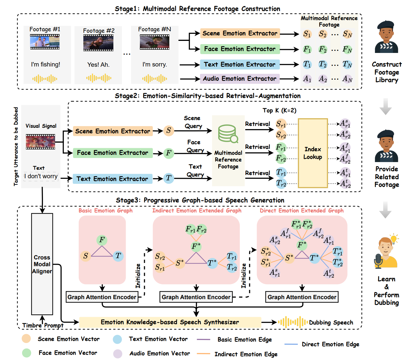 论文题目:Towards Authentic Movie Dubbing with Retrieve-Augmented Director-Actor Interaction Learning 作者:刘瑞 教授 (内蒙古大学)、赵源 (内蒙古大学25级博士研究生)、贾真琦 (内蒙古大学25级博士研究生) 论文简介:自动电影配音模型能根据给定剧本生成生动语音,通过简短的音色提示还原说话人的音色,同时确保与无声视频的口型同步。现有方法模拟了演员直接配音且无需准备的简化流程,忽略了关键的导演 - 演员互动环节。相比之下,真实配音流程涉及动态协作:导演会积极与演员沟通,引导他们在配音前内化语境线索,尤其是情感层面的线索。为解决这一问题,我们提出一种新的检索增强型导演 - 演员互动学习方案,以实现真实感电影配音,该方案被命名为Authentic-Dubber,包含三大创新机制:构建多模态参考素材库,模拟导演提供的学习素材。通过整合大型语言模型(LLMs),实现对跨模态信号情感表征的深度理解。提出基于情感相似度的检索增强策略,模拟演员在配音过程中高效、全面内化导演提供素材的过程。该策略会检索与目标无声视频最相关的多模态信息。开发基于渐进式图结构的语音生成方法,逐步融入检索到的多模态情感知识,从而模拟演员的最终配音过程。上述机制使 Authentic-Dubber 能够忠实复刻真实配音流程,在情感表现力上实现全面提升。在 V2C-Animation 基准数据集上的主观和客观评估均验证了该方案的有效性。 |