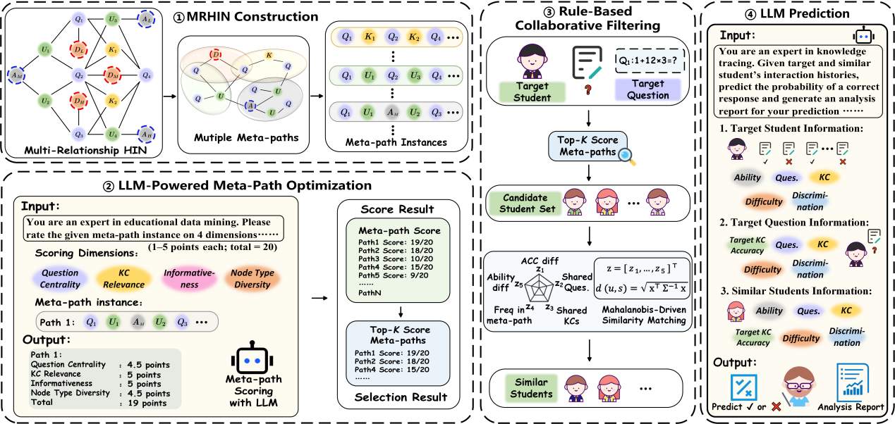 论文题目:HISE-KT: Synergizing Heterogeneous Information Networks and LLMs for Explainable Knowledge Tracing with Meta-Path Optimization 作者:段智议(内蒙古大学研究员),史子星(内蒙古大学2024级硕士研究生),袁宏宇(内蒙古大学2025级博士研究生),王琪(吉林大学副教授) 论文简介:知识追踪(KT)旨在挖掘学生知识状态的演变轨迹,并预测其未来的问题回答表现。然而,现有基于异构信息网络(HINs)的方法容易因元路径的手动或随机选择而引入噪声,且缺乏对元路径实例的必要质量评估。同时,基于大型语言模型(LLMs)的方法则忽视了跨学生的丰富信息,两种范式都难以持续提供准确且基于证据的解释。为解决这些问题,本文提出了一种创新的HIN-LLM协同增强的知识追踪框架(HISE-KT),该框架实现了HINs与LLMs的无缝整合。HISE-KT首先构建包含多种节点类型的多关系HIN,通过多条元路径捕捉结构化关联。随后运用LLM智能评分和筛选元路径实例,保留高质量路径,开创了元路径质量自动评估的先河。受教育心理学原理启发,本文设计了基于元路径的学生检索机制,为预测提供更有价值的上下文信息。针对四个公开数据集的实验表明,HISE-KT在预测性能和可解释性方面均优于现有KT基线模型。本文的研究通过将HINs与LLMs协同融合,为发展透明、自适应的教育人工智能建立了新范式。 |