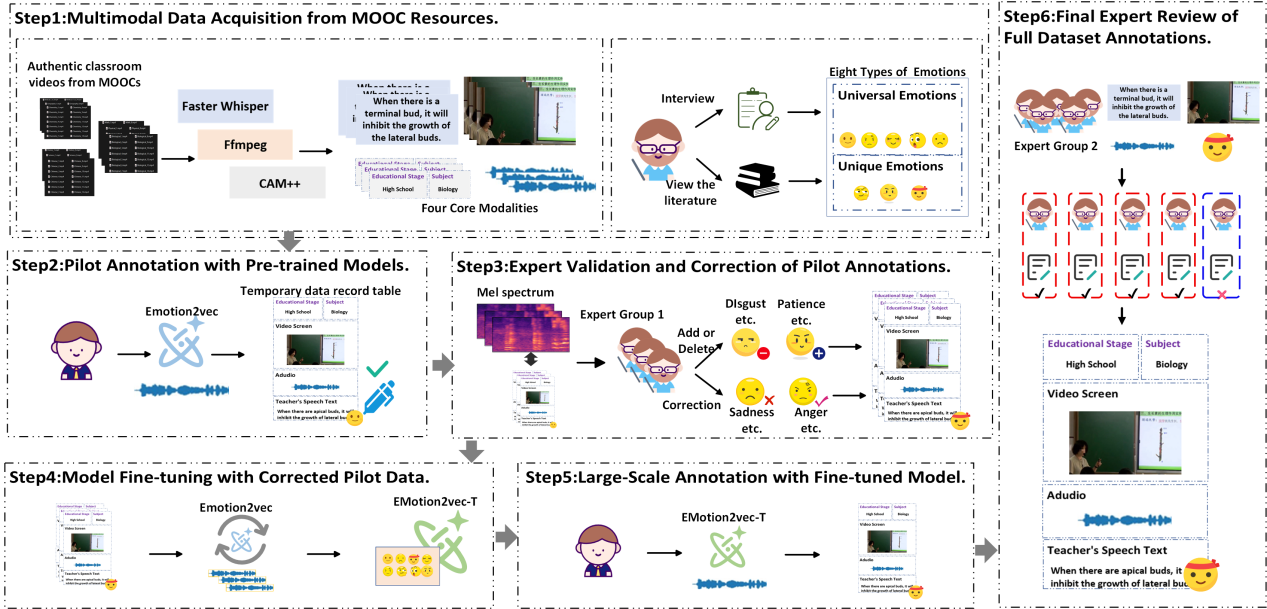 论文题目:Advancing Multimodal Teacher Sentiment Analysis: The Large-Scale T-MED Dataset & The Effective AAM-TSA Model 作者:段智议(内蒙古大学研究员),王祥任(内蒙古大学2024级硕士研究生),袁宏宇(内蒙古大学2025级博士研究生),邢千里(吉林大学副教授) 论文简介:教师的情绪状态在教育场景中至关重要,深刻影响教学效果、学生参与度和学习成绩。然而,由于教师情绪的演绎性,现有研究往往无法准确捕捉教师情绪,忽视了教学信息对情绪表达的关键影响。本研究通过相应地构建数据集和模型来系统地研究教师情绪分析。本研究构建了第一个大规模教师多模态情感分析数据集 T-MED。为了确保标记的准确性和效率,本研究采用了人机协作标记流程。T-MED 数据集包含来自 250 个真实教室的 14,938 个教师情感数据实例,涵盖从 K-12 到高等教育的 11 个学科,集成了多模态文本、音频、视频和教学信息。此外,本研究提出了一种新颖的基于非对称注意力的多模态教师情感分析模型AAM-TSA。AAM-TSA引入了非对称注意力机制和分层门控单元,以实现差异化的跨模态特征融合和精确的情感分类。实验结果表明,AAM-TSA 在 T-MED 数据集上的准确性和可解释性方面显著优于现有的最先进方法。 |