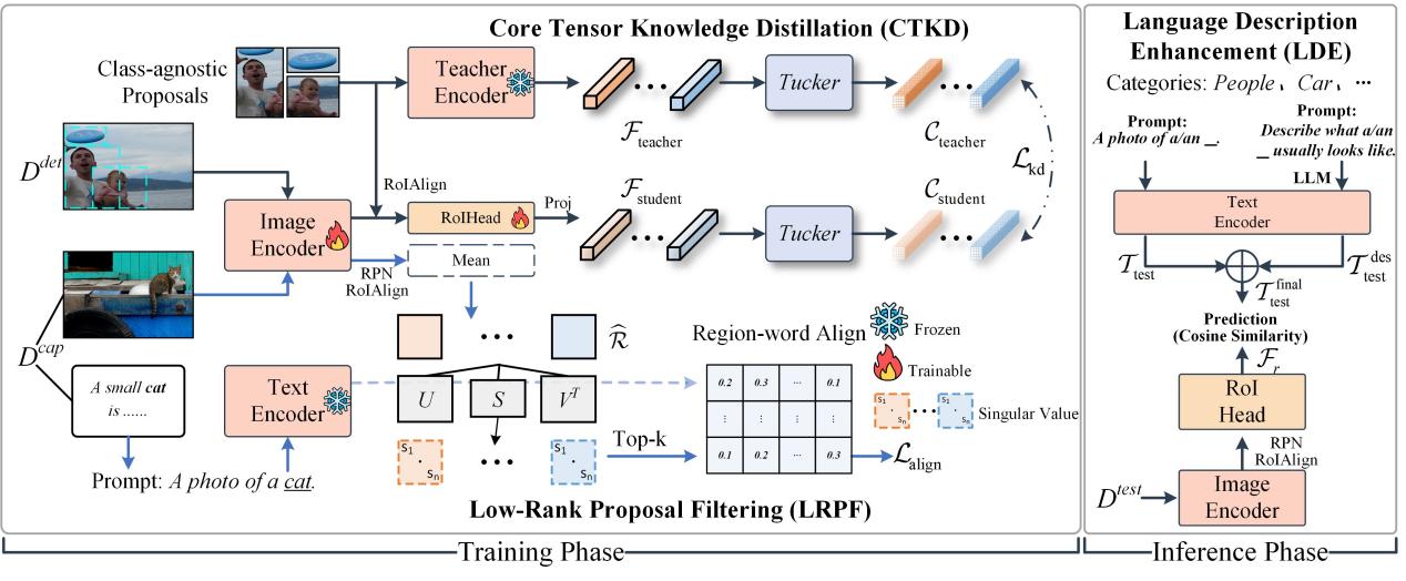 论文题目:Tensor Decomposition and Language Description for Open-Vocabulary Object Detection 作者:梁秋雨(内蒙古大学24级博士研究生),张永强(内蒙古大学)* 论文简介:开放词汇目标检测(Open-vocabulary Object Detection,OVOD)旨在突破固定类别限制,实现对未见目标的检测与识别。虽然现有研究基于区域-词语对齐(region-word alignment)和知识蒸馏(knowledge distillation)方面取得了进展,但其性能仍受三大问题制约:区域与词语对齐不精确、知识蒸馏存在冗余传递,以及类别嵌入表示质量较低。针对上述问题,本文提出了一种结合张量分解(Tensor decomposition)与语言描述(Language descriptions)的新颖的开放词汇目标检测框架,TLDet。在传统方法中,最高相似度得分的候选框常聚焦于判别性强但局部不完整的区域(如仅包含目标头部),导致区域-词语对齐偏差。为此,本文提出了低秩候选框筛选模块,通过奇异值分解计算候选框特征矩阵的奇异值之和,定量衡量其结构完整性,从而筛除判别性强但不完整的区域,显著提升视觉区域与文本语义之间的对齐精度。为避免知识蒸馏过程中的信息冗余,TLDet进一步引入核心张量蒸馏方法。该方法基于 Tucker 分解,将教师模型与学生模型的特征映射为核心张量,通过核心张量的优化对齐,实现高效且有选择性的知识迁移,使学生模型能够聚焦于教师模型中的关键特征表示。此外,为增强类别语义嵌入的表达能力,本文设计了语言描述增强机制。该机制在推理阶段引入大语言模型(LLM)的语义知识,通过生成丰富的类别语言描述,弥补开放词汇场景中长尾类别和模糊类别的语义缺失问题,从而提升类别嵌入的区分性与泛化能力。在 COCO 与 LVIS 主流开放词汇目标检测数据集上的实验结果表明,TLDet 在新类别检测任务中表现突出,分别取得 36.1% 的 mAP 和 30.1% 的 mask mAP,显著超越现有开放词汇检测方法,验证了其在开放世界视觉理解中的有效性与优越性能。 |