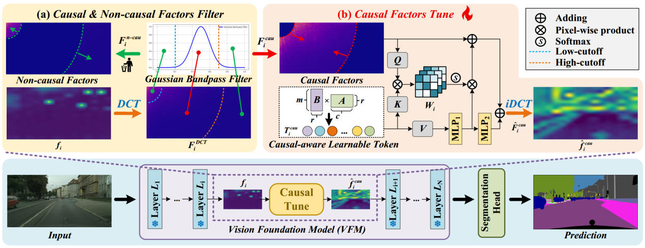论文题目:Causal-Tune: Mining Causal Factors from Vision Foundation Models for Domain Generalized Semantic Segmentation 作者:张印(哈尔滨工业大学21级博士生),张永强(内蒙古大学)*,郑尧月(西安交通大学21级博士生),Bogdan Raducanu(巴塞罗那自治大学),刘丹(哈尔滨工业大学) 单位:哈尔滨工业大学仪器科学与工程学院,巴塞罗那自治大学计算机视觉中心,内蒙古大学计算机学院 论文简介:在域泛化语义分割(Domain Generalized Semantic Segmentation, DGSS)任务中,仅微调视觉基础模型(Vision Foundation Models, VFMs)的少量参数就可以显著的提升DGSS的性能。现有的方法通常通过训练轻量级adapters或优化中间层特征来提升模型在未知域上的泛化能力。然而,这些方法往往忽视了一个关键问题:预训练的VFMs常常会产生特征伪影,这些伪影会阻碍VFMs中有价值feature的利用,从而削弱DGSS的性能。受因果机制的启发,本文发现这些伪影与非因果因素相关,而这些非因果因素通常存在于VFMs特征谱的低频和高频部分。本文针对DGSS任务,显式地分析了VFMs特征中的因果与非因果因素,并提出了一种简洁而高效的方法来识别并解耦二者,从而实现更稳健的域泛化。为此,本文提出了Causal-Tune——一种新颖的微调策略,旨在从VFMs特征中提取因果因素并抑制非因果因素。首先,本方法利用离散余弦变换(Discrete Cosine Transform, DCT)提取每一层特征的频谱;随后,采用高斯带通滤波器将频谱划分为因果与非因果部分。为了进一步优化因果部分,本方法在频域中引入了一组因果感知的可学习tokens来进行特征增强,而非因果部分则被丢弃。最后,将优化后的因果特征通过逆DCT转换回空间域,并输入下一层。本方法在大量跨域实验中验证了Causal-Tune的有效性,尤其在恶劣天气条件下表现突出,如雪天场景中相比基线方法mIoU提升了4.8%。 |