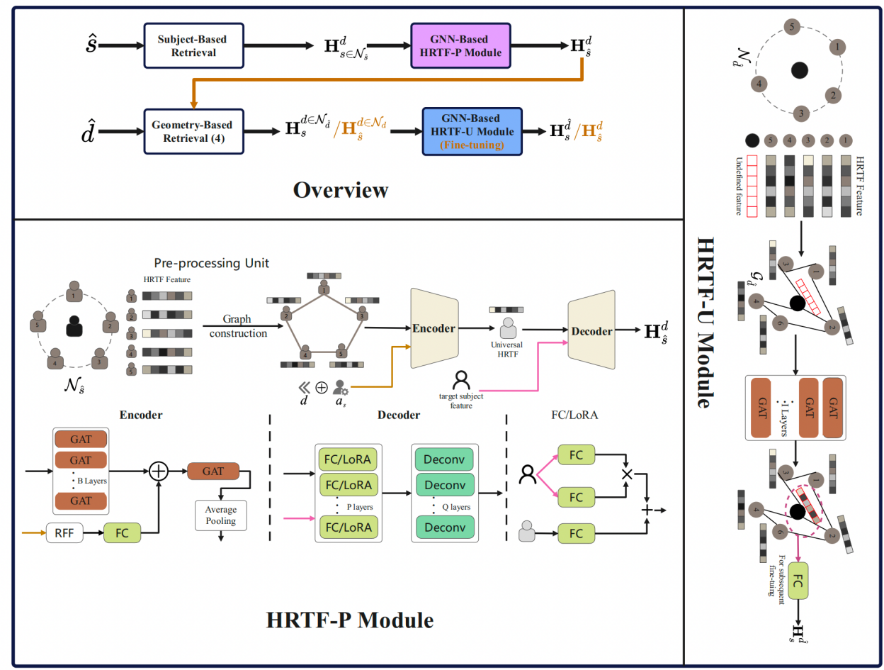 论文题目:Graph Neural Field with Spatial-Correlation Augmentation for HRTF Personalization 作者:呼德 研究员 (内蒙古大学)(通讯作者)、胡俊升 (内蒙古大学硕士研究生)、姜翠翠 (内蒙古大学硕士研究生) 论文简介:为了在虚拟现实/增强现实等设备中实现沉浸式3D音频渲染,高质量的头相关传递函数(Head Related Transfer Function, HRTF)不可或缺。然而,HRTF的测量费时且费力。同时,HRTF不仅依赖声源位置,还与头围、躯干、耳型等人体特征强相关。为了给新用户快速生成个性化HRTF,我们提出了一种空间相关性增强的图神经场(Graph Neural Field with Spatial-Correlation Augmentation, GraphNF-SCA)模型,其包含三个核心部分:(i) HRTF个性化模块、(ii) HRTF上采样模块、(iii) 微调阶段。在个性化模块中,通过一种编码器-解码器架构的图神经网络进行目标用户的个性化HRTF预测;上采样模块则采用另一图神经网络实现了HRTF的空间插值,其有效学习了HRTF数据在空间上的相关性;最后,将个性化模块的输出喂给上采样模块,再对后者进行微调,进而强化了个性化HRTF在空间上的相关性。与现有方法相比,GraphNF-SCA通过有效挖掘HRTF之间固有的空间相关特性,显著提升了HRTF个性化性能。实验结果表明,所提方法在多个HRTF数据集上均达到了最优性能。 |