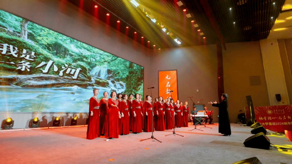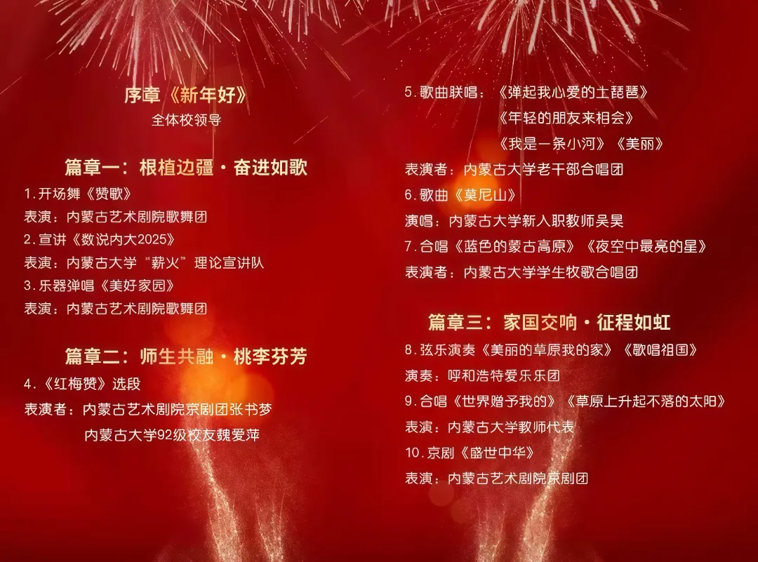 2025年12月30日 内蒙古大学举办“桃李同心·元启新程” 喜迎2026新年联谊晚会 共赏新年烟花秀 晚会邀请了老领导、校友代表 附中附小、内蒙古大学人民医院、师生代表等 当《盛世中华》的最后一个高腔 如烟花般在桃李大讲堂璨然绽放 2026年的第一缕晨光已提前叩响 这不是一场普通的岁末演出 这是一次用音符书写的年度答卷 一次让艺术与校园 传统与现代 师长与学子 心跳同频的深情共振 学校领导班子向全校师生致以新年祝福 根植边疆·奋进如歌 帷幕拉开 校领导们的祝福犹在耳畔 一道炽烈奔放的生命力 便自舞台中央奔涌而来 那不是序幕,而是迸发 歌声与舞步是《赞歌》最炽热的注脚 那不是舞台上的表演 那是蛰伏在每一位内大人血脉中的豪情 被瞬间点燃 舞台上的他们 与台下每一双光亮的眼睛 共同完成了一场关于“奋进”的叙事 “薪火”宣讲队的青年学子们 以严谨而闪亮的数据 为这场奔涌的情感筑起了坚实的基石 成就与愿景 不再只是纸上的文字 而是内大人砥砺前行的光辉足迹 当呼麦从大地深处升起 马头琴如风吹过草浪 古筝流淌出古老的时光…… 《美好家园》的每一个音符都在诉说 我们的根 深深扎在这片辽阔的土地上 并从中汲取着无尽力量 开场舞《赞歌》 宣讲《数说内大2025》 乐器弹唱《美好家园》 师生共融·桃李芬芳 最动人的乐章 在躬身俯首的代代接力传承间摇曳生光 当京剧《红梅赞》的雅韵响起 92级校友魏爱萍与张书梦老师的声线韵律交织 将梨园的风雅 化作校园里的可亲可感 这是一次代际传承最生动的呈现 让国粹之美 在共吟中立根发芽 当老教师们唱起《弹起我心爱的土琵琶》 岁月在歌声中褪去风霜 露出青春的底色 而《年轻的朋友来相会》响起时 台下的年轻学子情不自禁地跟唱 那一刻 没有讲台与座位的区隔 只有理想穿越时光的共鸣 新入职教师代表吴昊的一曲《莫尼山》 清亮而坚定 那是新鲜血液注入江河的宣告 牧歌合唱团将《蓝色的蒙古高原》 与《夜空中最亮的星》巧妙编织 在他们身上 我们看到了内大的未来 扎根边疆 却拥有仰望整个星空的胸怀 抽奖环节的欢笑 则让这场精神盛宴 落入了人间烟火的温情之中 《红梅赞》选段 合唱《年轻的朋友来相会》 合唱《我是一条小河》 独唱《莫尼山》 合唱《蓝色的蒙古高原》 合唱《夜空中最亮的星》 家国交响·征程如虹 晚会的氛围在最终章走向壮阔 爱乐乐团用乐器深情诉说 《美丽的草原我的家》 又在《歌唱祖国》中汇成磅礴洪流 这不仅是音乐的融合 更是情感的升华 我们从故乡的原点出发 最终抵达对家国天下的深情眷恋 老师们的歌声 清澈而明亮 他们站在“世界”赠与的舞台上 歌唱心中“不落的太阳” 台上,师者如星 台下,学生是星轨长河 这或许就是教育最诗意的写照 我照亮你 而你成就了广阔无垠的世界 真正的高潮 属于《盛世中华》 长绸飞舞 如泼洒的丹青 靠旗飞扬 似猎猎的华章 当传统京剧的鼓点 以前所未有的气势敲响 一种文化自信与时代豪情 击中了在场每一个人的心灵 这不仅仅是表演 而是一次集体文化寻根 爱乐乐团弦乐演奏 《美丽的草原我的家》 爱乐乐团弦乐演奏 《歌唱祖国》 合唱《世界赠予我的》《草原上升起不落的太阳》 京剧《盛世中华》 晚会结束了 但那些旋律会长久回荡 在离场时师生哼唱的片段里 在朋友圈刷屏的图文里 更在每一个内大人迈向2026年的 更加坚定有力的步伐里 烟花盛放·内大荣光 当最后一个音符在夜色中温柔沉降 另一场盛大的绽放正在酝酿 那不是转瞬即逝的焰火 那是我们蓄积了一整年的磅礴心声 对星空的深情倾诉 对时代的响亮回答 每一朵怒放的璀璨 都是守望相助的誓言在夜空写下的诗行 每一声震撼心魄的鸣响 都是“崇尚真知、追求卓越”的初心与共鸣 今夜 这光芒属于每一个你 在内大遇见你是我今生最美的风景 而你的奋斗 正成为这片风景中最昂扬的篇章 烟花下相拥的笑脸 比星光更暖 共同仰望的我们 比焰火更炽热 我们以艺术的方式 对过去致敬 对现在总结 对未来展望 当灯火渐熄 人群散去 那份被音乐点燃的温暖与力量 已沉淀为内大人共同的精神底色 一抹崭新而亮丽的光辉 今夜,我们共聆华章 明朝,我们共赴山海 2026,内大人,启程! 上一条:喜报!我校以优异成绩通过来华留学生高等教育质量认证 下一条:@IMUers!2026,启程!