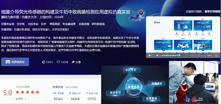 课程介绍:该虚拟仿真实验聚焦区域特色与优势乳产业,汲取创新性研究成果,流程再现了“制备细菌基荧光探针→构建荧光传感检测方法→检测牛奶中致病菌”全过程,是研究探索型实验。课程突破传统实验的时空与条件限制,将“细菌传感器”这一前沿设计引入教学。实验涵盖五个模块,对应完整科研流程,使学生不仅掌握基础操作与原理,更能系统理解实验设计、数据处理与结果分析的全过程,提升解决复杂问题的能力。课程注重拓展教学深度与广度,强化理论基础,倡导探究性与个性化学习,着力培养学生创新思维与批判性思辨能力,具有产教融合和科教融汇鲜明特点,满足多学科交叉复合型人才培养需求。同时,实验面向食品安全关键技术,融入食品安全预警使命,引导学生树立专业担当与社会责任感,实现知识学习、能力培养与价值塑造的有机统一。