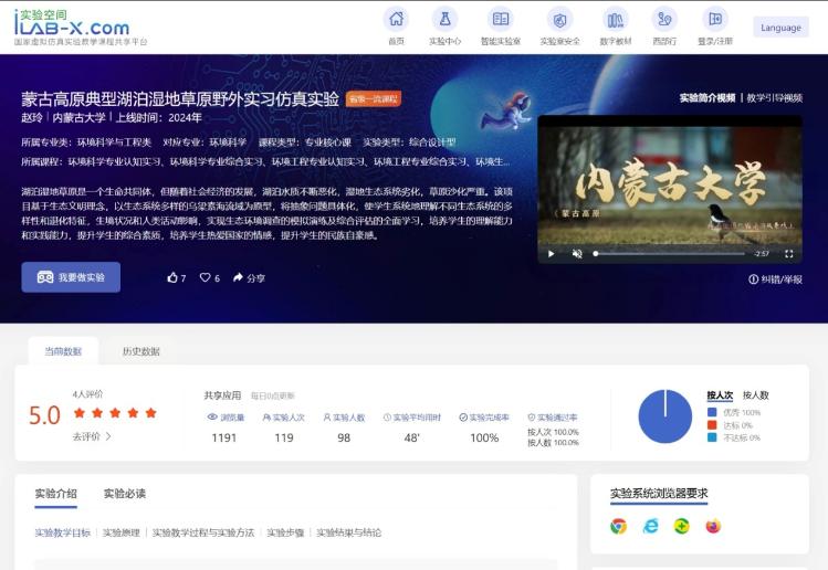 课程介绍:本野外实习虚拟仿真实验项目秉持生态文明理念,以山水林田湖草沙系统治理思想为引领,借助虚拟仿真技术,开展针对蒙古高原典型湖泊、湿地及草原生态系统的野外实习理论教学与实践操作训练,旨在推动现代信息技术与环境科学与工程、生态学实验教学的深度融合,提升教学质量与效果。学生可通过虚拟仿真的湖泊、湿地与草原生态系统场景,获得对蒙古高原典型生态系统的直观感性认知。在此基础上,学生将掌握涵盖水、土、生物等要素的采样、分析及测定方法,并依据调查分析结果,对生态环境状况进行综合评估;特别针对蒙古高原冬季严寒的特殊气候条件,本实验设计了湖泊冰封期与非冰封期的水环境调查环节。在确保涵盖基本知识与技能等核心要素的同时,提升学习者在虚拟仿真实验教学过程中的交互体验与反思能力,从而有效提升学生的实验实践能力与专业素养。本实验注重将理论知识点与中国特色社会主义道路建设、生态文明建设紧密结合,旨在培养学生的国家情怀,激发学生的民族自豪感。