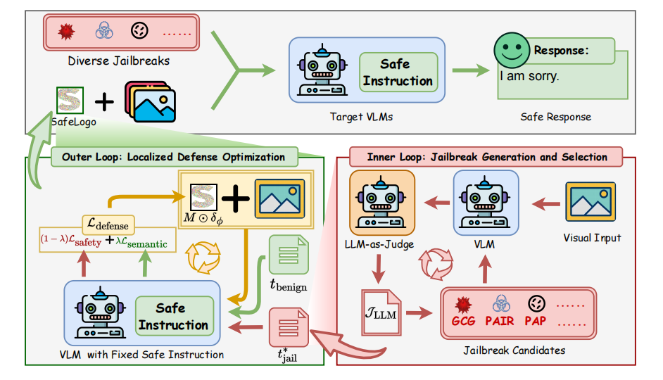 论文聚焦视觉语言模型(VLMs)愈发容易受到越狱攻击的影响——这类攻击通过对抗性提示的微妙操控绕过模型的安全对齐机制。越狱攻击的多样性与适应性要求防御机制具备强大的泛化能力。然而,对大规模VLMs进行微调计算成本高昂,且引入过多的视觉或文本防御提示会损害图像真实性与模型可用性。论文提出SafeLogo,该方法通过微区域对抗训练,将徽标尺寸的视觉提示调优为抵御多种越狱攻击的通用防护盾。我们首次将最小-最大对抗优化融入视觉防御提示生成过程:在外循环中,SafeLogo将紧支撑的有界扰动注入极小的图像区域(像素覆盖范围),有效兼顾视觉保真度与语义一致性;同时,为克服现有防御局限于单一攻击方向或固定良性监督的缺陷,内循环从多种越狱攻击中动态生成并筛选出最强攻击策略。在LLaVA-1.5-13B、MiniGPT-4及Qwen3-VL上的大量实验表明,SafeLogo显著降低了MM-SafetyBench、VLGuard和FigStep上的越狱成功率,同时在MM-Vet和MME基准上保持了良性性能。