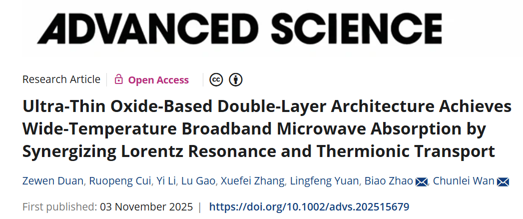 近日,内蒙古大学段泽文特聘研究员(一作)、清华大学万春磊教授(通讯)及复旦大学赵彪副研究员(通讯)在国际顶刊Advanced. Science(中科院一区,IF:14.1,内蒙古大学为第一单位)发表题为“Ultra-Thin Oxide-Based Double-Layer Architecture Achieves Wide-Temperature Broadband Microwave Absorption by Synergizing Lorentz Resonance and Thermionic Transport”的研究论文。清华大学崔若鹏博士及北京化工大学李宜副教授作为重要贡献者在该工作理论分析中给予了极大支持。