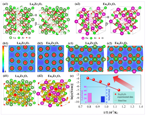 电荷密度揭示了La2Zr2O7和Eu2Zr2O7晶体单元格内固有的氧空位缺陷(用红圈标出),表明稀土锆酸盐陶瓷(REZCs)中固有的高浓度氧空位。这些空位主要源于稀土锆酸盐陶瓷(REZCs)中镧系元素(Ln)原子与锆(Zr)原子之间的理论价态不等价,理想情况下,它们应该是电中性的。此外,根据电子探针微分析(EPMA)测量,La2Zr2O7和Eu2Zr2O7的氧/锆原子比小于3.5,这意味着除了固有氧空位外,稀土锆酸盐陶瓷(REZCs)中还有额外的带正电荷的氧空位以确保整体电中性。这些额外的氧空位可能与固有的氧空位共享一些正电荷,从而有效地稳定了稀土锆酸盐陶瓷(REZCs)的晶格结构。与La2Zr2O7低热离子传输相比,Eu2Zr2O7在高温下表现出较高的离子传导特性。氧离子的长程迁移导致高离子电导率,推动洛伦兹介电共振向洛伦兹型离子传导行为的转变。
