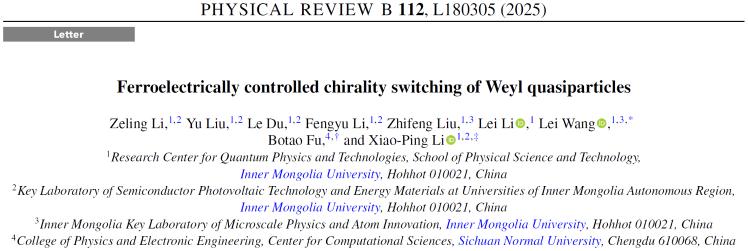 近日,我校物理科学与技术学院李小平研究员和王磊研究员在拓扑量子态的操控方面取得重要突破,相关成果以“Ferroelectrically controlled chirality switching of Weyl quasiparticles”为题,以Letter的形式发表于物理学科知名期刊 Physical Review B上。李小平研究员、王磊研究员与四川师范大学付波涛副教授为共同通讯作者,博士生李泽玲为第一作者,内蒙古大学为论文第一完成单位。